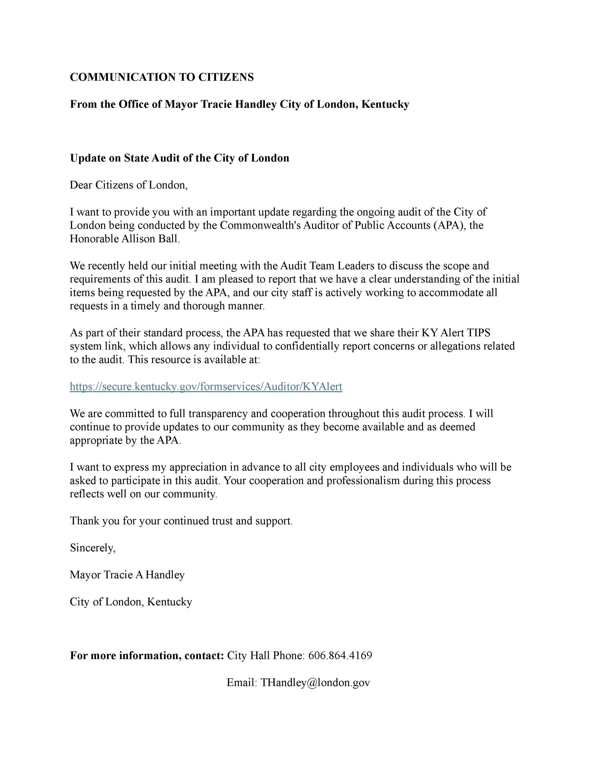 The City of London, Kentucky, operates its programs and services without regard to race, color, or national origin in accordance with Title VI of the Civil Rights Act of 1964. The City of London is committed to providing reasonable accommodations and access to individuals with disabilities. If you require accommodation to access any City service, program, or activity, please contact the City Clerk to request assistance.